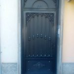 Puerta de entrada a edificio según dibujos elegidos por los propietarios del mismo,pintada en gris medio con cristal satenglas de 5mm.