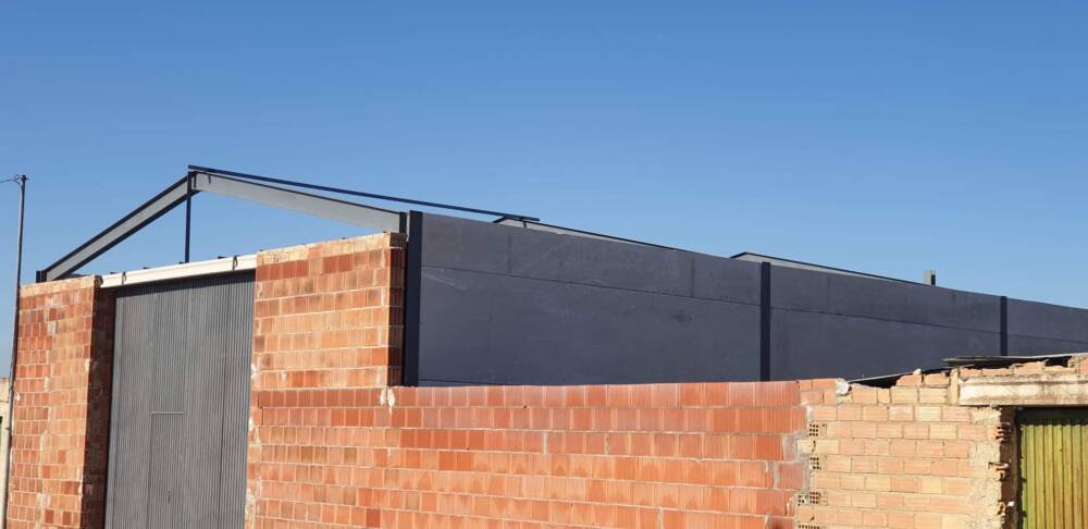 Construccion de nave de 180 m2 para uso agricola,con estructura metalica,cerramiento de paredes con placas prefabricadas de hormigón,ubierta de chapa sandwich de 30mm blanco-blanco,petos en fachada trasera y delantera con puerta corredera dos hojas,tambien se realiza trabajo de cimentacion y elaboracion de zunchos para dicha nave.